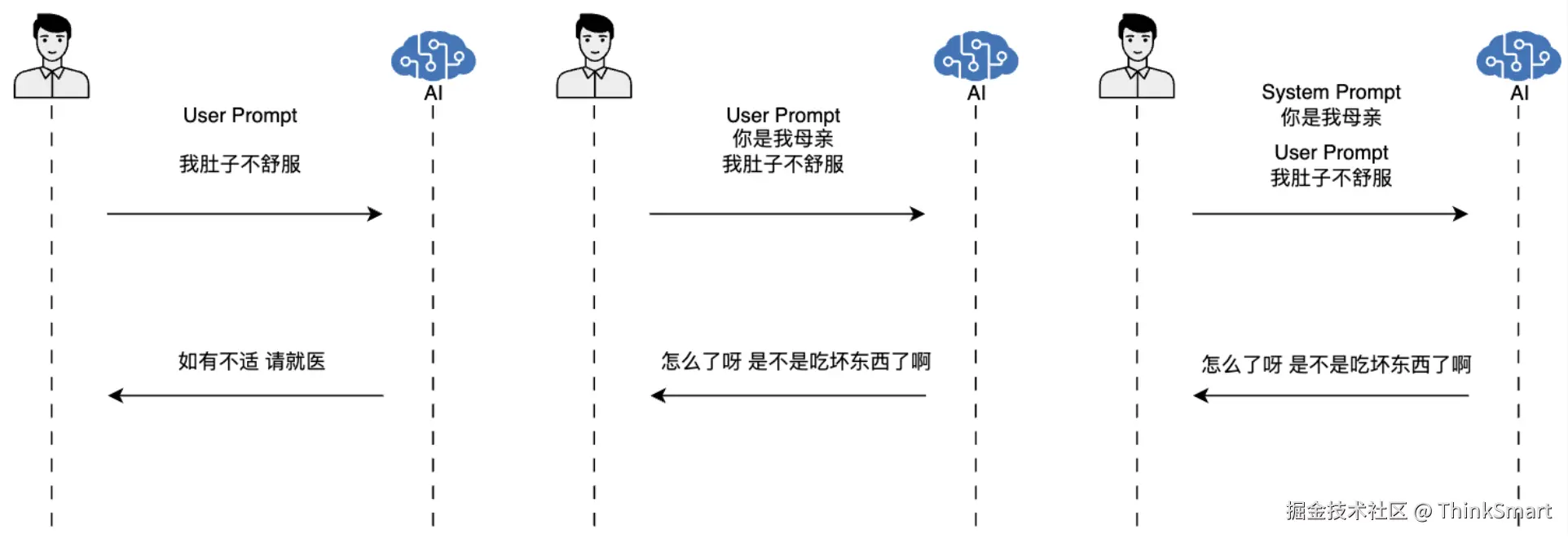 当我们给AI大模型加上Prompt的时候,就相当于给了AI一个角色、性格、背景知识、语气等等设定,只要不是用户输入的,都可以是System Prompt