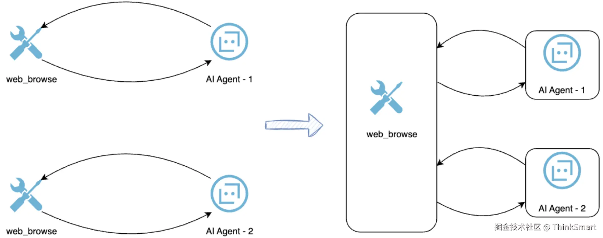 可是这样的方式会导致很多Tool的功能其实是通用的,但是要在多个Agent中都写一份,这样显然是不合理的