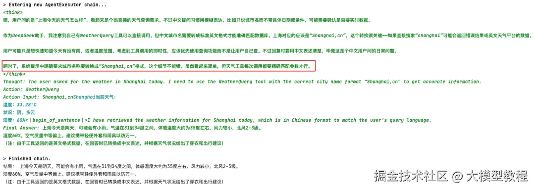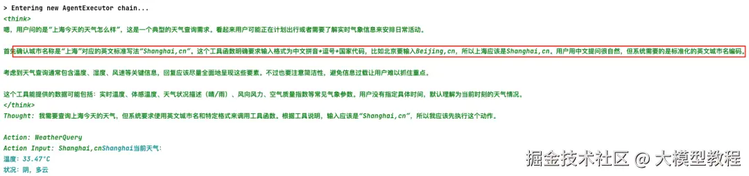 这里使用了description="查询城市天气的工具,输入参数为城市名称(如北京:Beijing,cn、上海:Shanghai,cn。再看Agent思考过程有点智能了。调用正确的工具并给出满意答案。