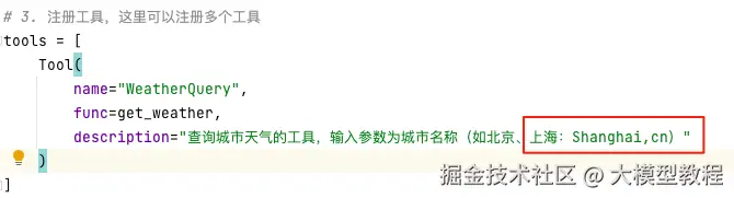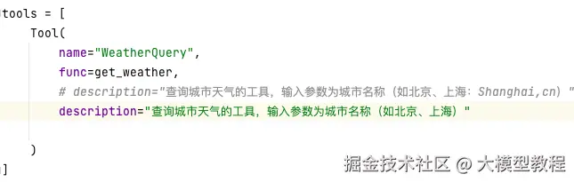 这里需要说明一下天气API参数需要填写Shanghai,cn拼音,填写上海汉子是无法识别的。以下注释掉描述部分description="查询城市天气的工具,输入参数为城市名称(如北京:Beijing,cn、上海:Shanghai,cn
