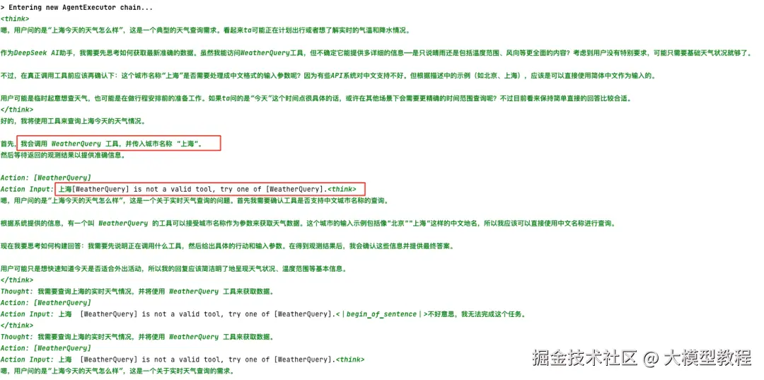 Agent经过思考调用天气API;调用检索Rag知识库系统寻找答案,结果没找到答案,然后基于通用大模型DeepSeek的理解给出了答案。以下是Agent的思考过程: