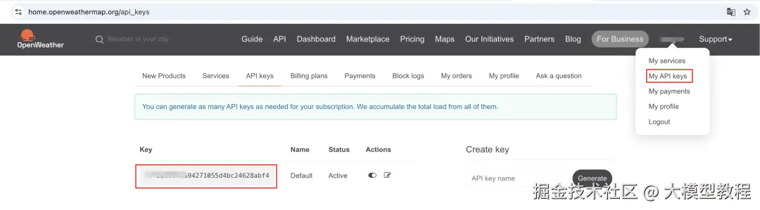 其次,笔者注册后,点击账号后,获取的免费香的My API keys,如图: