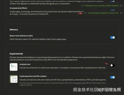 Claude新出了Code execution and file creation这个experimental feature,不过和原来的Anylysis tool是互斥的,开启"文件创作模式"时,系统会自动关闭"Analysis tool"。因为这是两个并行的的沙箱环境。