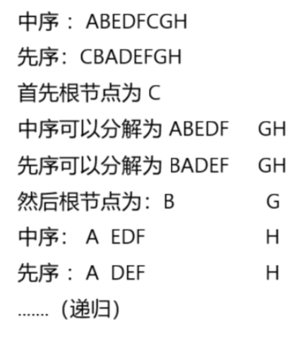- 在中序遍历序列中找到根节点的位置,左侧为左子树的中序遍历,右侧为右子树的中序遍历。