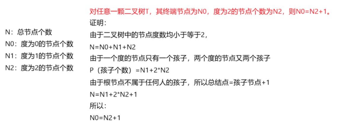 对任意一颗二叉树T,其终端节点为N0,度为2的节点个数为N2,则N0=N2+1。