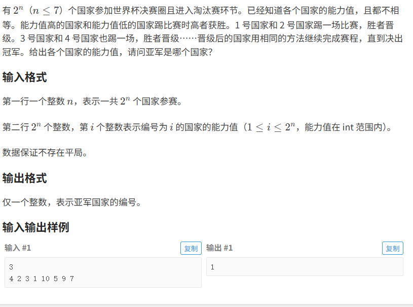 题目的意思是:让2^n个人进行比赛,直到比到最后,输出亚军的编号