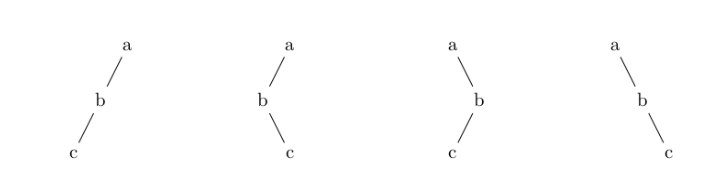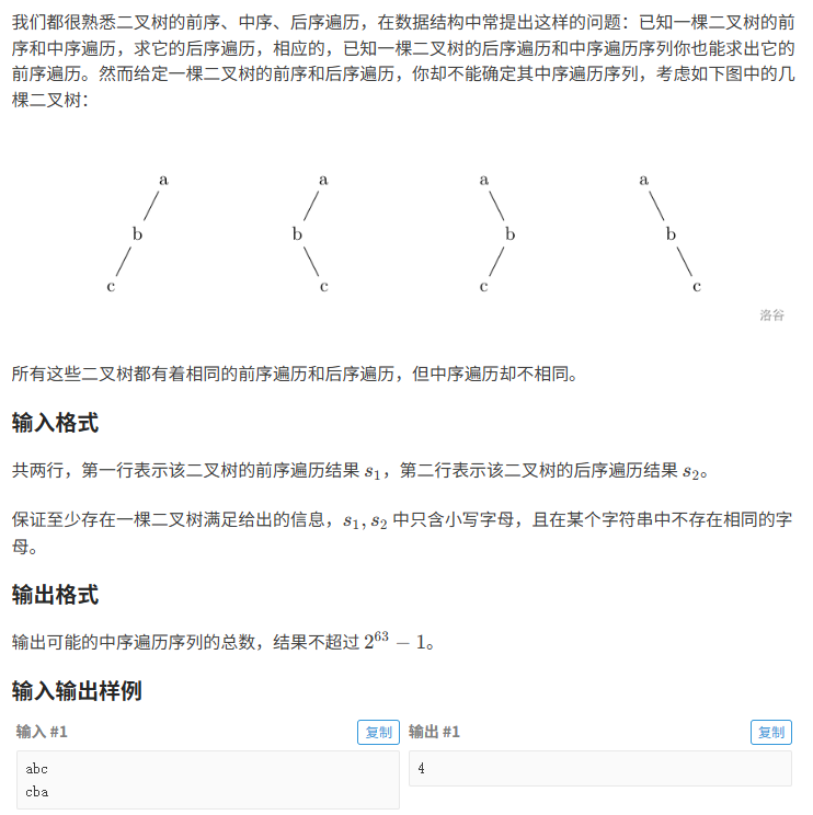 - 在一颗树上若有一个若有一个结点是只有一个子结点的,那么这个子结点在左在右不影响先序后序的遍历顺序,那么总树数就要乘以2(乘法原理,这个子结点有两种选择,一种成为左子树,一种成为右子树)