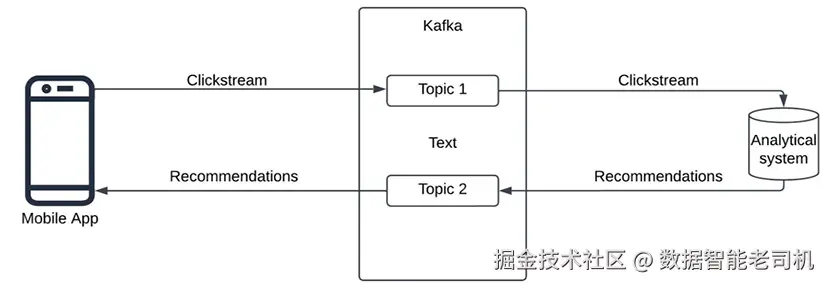 该系统的关键挑战在于:点击流需在生成时即可用于分析 以产出合适的推荐/优惠;并且一旦生成推荐/优惠,需实时回传 至应用侧展示给用户。Apache Kafka 可通过不同 topic 同时支持这类双向/双通道通信。