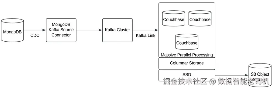 本节我们设计一个实时分析系统 :从基于文档的 NoSQL 事务系统摄取数据,导入到分析系统中,并由分析系统驱动实时看板 。相较于在关系型数据上做实时分析,在文档型 NoSQL 上做实时分析会面临更多挑战,这些挑战因文档数据模型的无模式(schema-less)特性而加剧。为在文档数据模型上构建实时系统,我们需要能够对文档数据执行分析的专用技术 。在本示例中,我们使用 MongoDB 作为事务系统,使用 Couchbase 作为实时分析的分析系统。