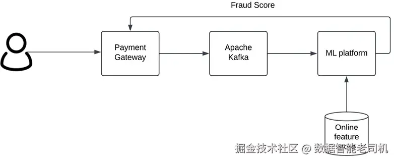 为了在实时 中完成打分,系统需按如下流程运作:用户发起交易后,支付网关处理请求,并通过 Kafka 等消息总线将交易详情发送至 ML 平台 进行打分。在 ML 平台中,首先从在线特征库(online feature store)提取与该交易相关的特征。在线特征库是一种具有极低延迟 服务能力的数据存储,持有模型打分所需的全部特征,使特征可即时用于推断。可选工具包括 Tecton 与 Feast。特征示例:用户常住地、用户平均交易金额、交易频率等。基于这些特征,ML 模型为交易生成欺诈分数。