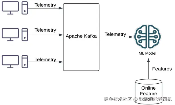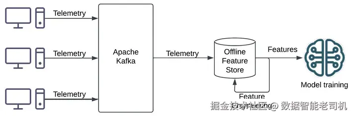 - 模型训练数据收集 :从各源系统收集遥测信息(如 SAR 指标、操作系统日志、网络日志 等),通过 Apache Kafka 等流式平台写入离线特征库 ;对原始数据进行特征工程,提取特征并训练模型。