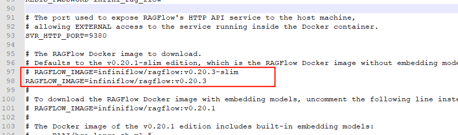 下载后解压文件,进入到:ragflow-main\docker目录,修改目录中的.env文件找到RAGFLOW_IMAGE=infiniflow/ragflow:v0.20.3-slim将它改成RAGFLOW_IMAGE=infiniflow/ragflow:v0.20.3如图: