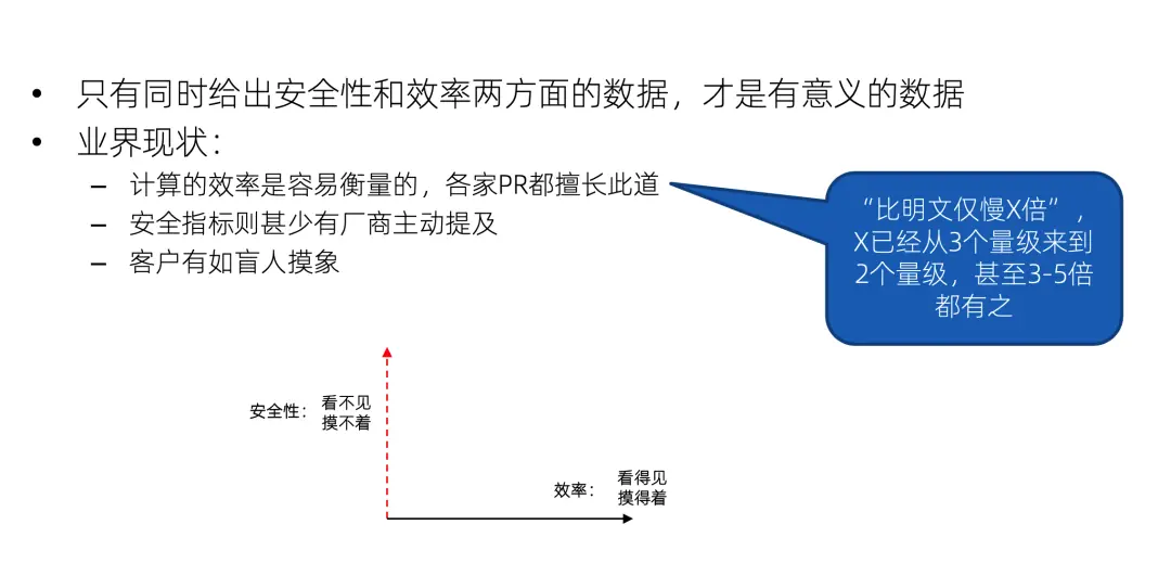 但是因为效率是最容易衡量的,大家都非常擅长 PR 这个X轴,比如能做到仅比明文计算慢多少倍,有的人说三个量级,有的人说两个量级,甚至我最近看到说比明文仅慢 3 到 5 倍的都有。