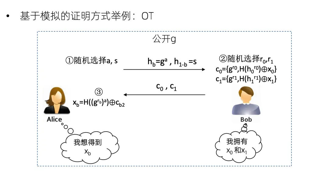 再来看一个基于模拟的证明方式的例子,以一个简单的OT协议为例。Bob 拥有两个数 x0 和x1,Alice 想得到其中一个,但她不想告诉 Bob 她想得到哪一个。