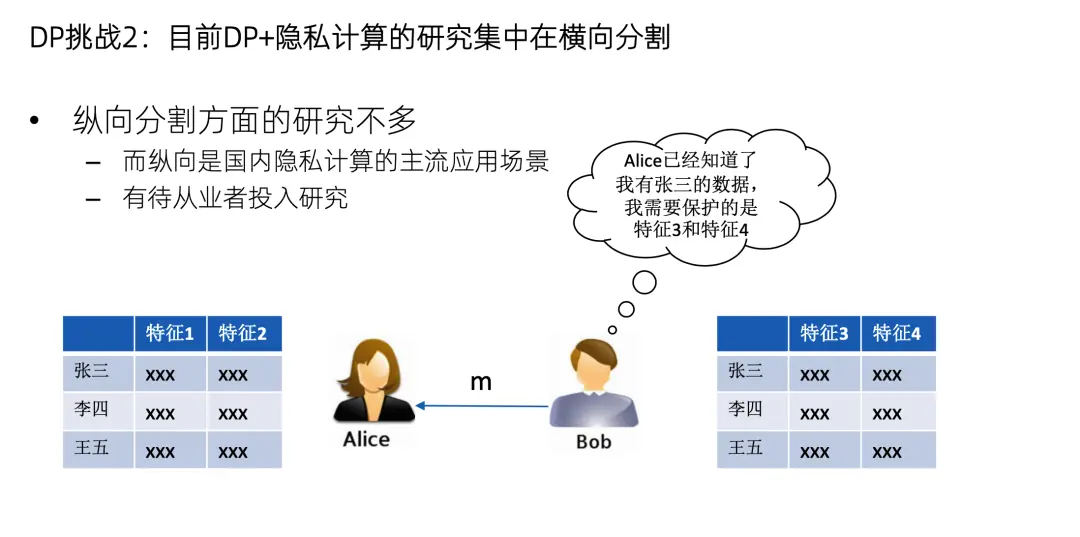 但是DP在纵向分割方面的应用研究不多。纵向建模是已经把样本对齐了的,也就是Alice 已经知道Bob有张三的数据了,现在保护的目标不是张三的数据在不在,而是张三的特征是多少,这需要新的DP方法,但这方面的研究目前还不多。