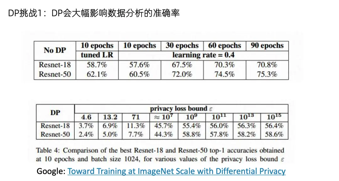 例如Google的一篇最新的文章,在imagenet上训练一个神经网络。没有 DP 的话,准确率可以达到 60% 到 70%。但是开了 DP 之后,准确率就跌到3%~10%。所以在这种大规模数据建模场景中,如何使用差分隐私又不影响性能,是一个非常有挑战的问题。
