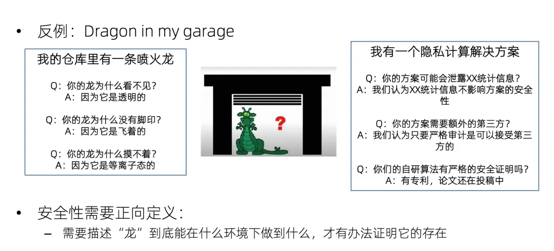 隐私计算的安全性也是如此,如果不使用可证明安全来正面的论证一个隐私计算方案的安全性,而是被动地等着别人来挑战,那就跟仓库喷火龙一样,无论怎么攻击都可以圆过去。