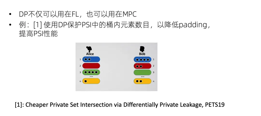 DP也可以用在 MPC,例如PSI隐私求交集,大家可能经常会用到分桶来做 PSI,因为整个全集都跟对方逐个比较性能太低了,所以一般都是分成好几个桶,比如尾号是 1 的一起比一下,尾号是 2 的一起比一下,这样会比较快,也便于并行。但是这样可能会泄露一个信息,就是尾号是 1 的数据量,这是属于ideal world没有的额外信息,因此是需要保护的,一般的 PSI 解决这个问题是通过padding填充,例如Alice原来尾号是 1 的有两个数据,现在把它填到四条,Bob也不知道Alice到底有多少条数据尾号是1。