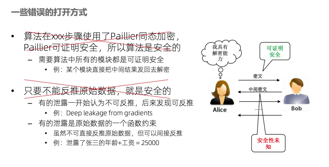 例如很多联邦学习算法,中间信息是Alice用 paillier加密发给 Bob,这步是没问题,但 Bob 计算完之后就发回去Alice解密继续做其他的计算。这一步解密产生的信息泄露如果没有论证,其风险就是未知的。