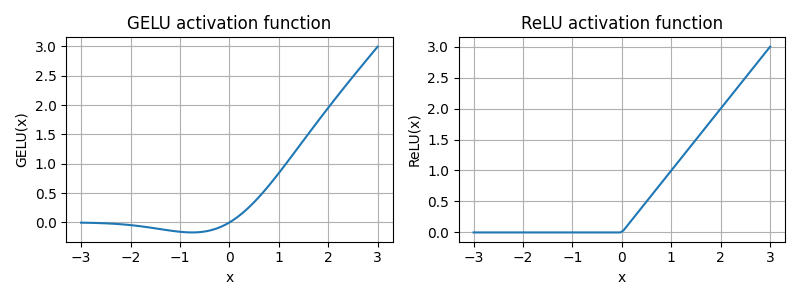 for i, (y, label) in enumerate(zip([y_gelu, y_relu], ["GELU", "ReLU"]), 1):