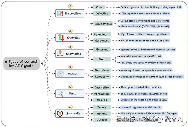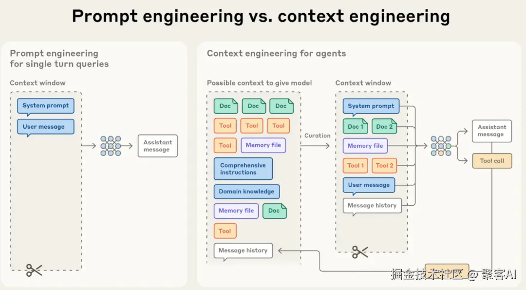 - 上下文工程:管理整个上下文状态,包括系统指令、工具、外部数据、历史消息等所有可能进入上下文窗口的信息。核心是"管理信息流",专为多轮推理和长时程任务的AI Agent设计。