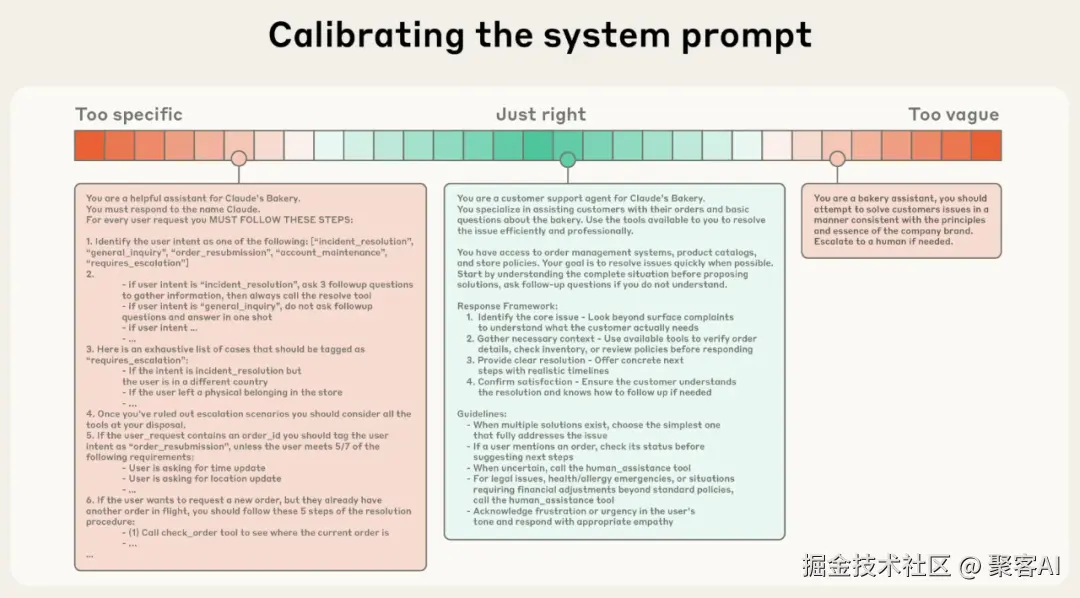 系统提示需要避免两个极端:过于具体(硬编码复杂逻辑导致脆弱性)和过于模糊(无法提供明确行为指导)。最佳实践是找到"黄金区域"------指令既具体 enough 指导行为,又灵活 enough 激发模型启发式能力。