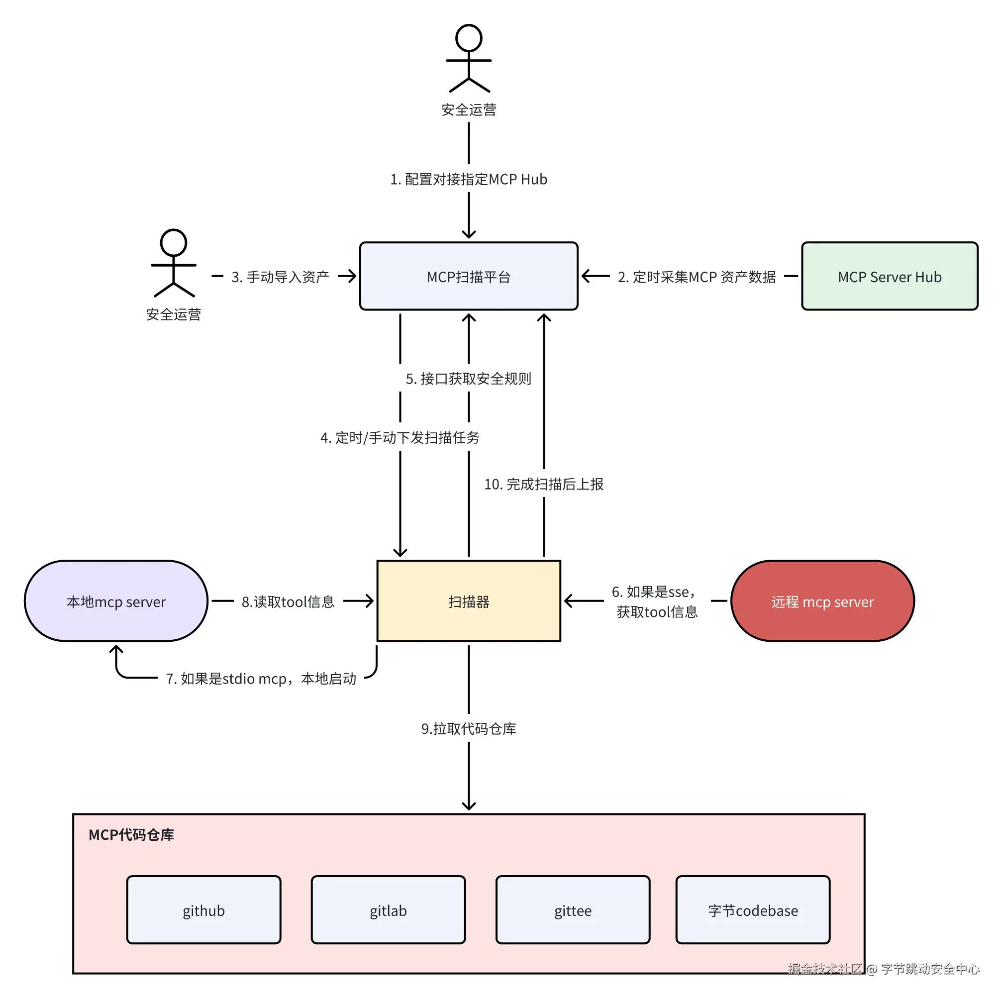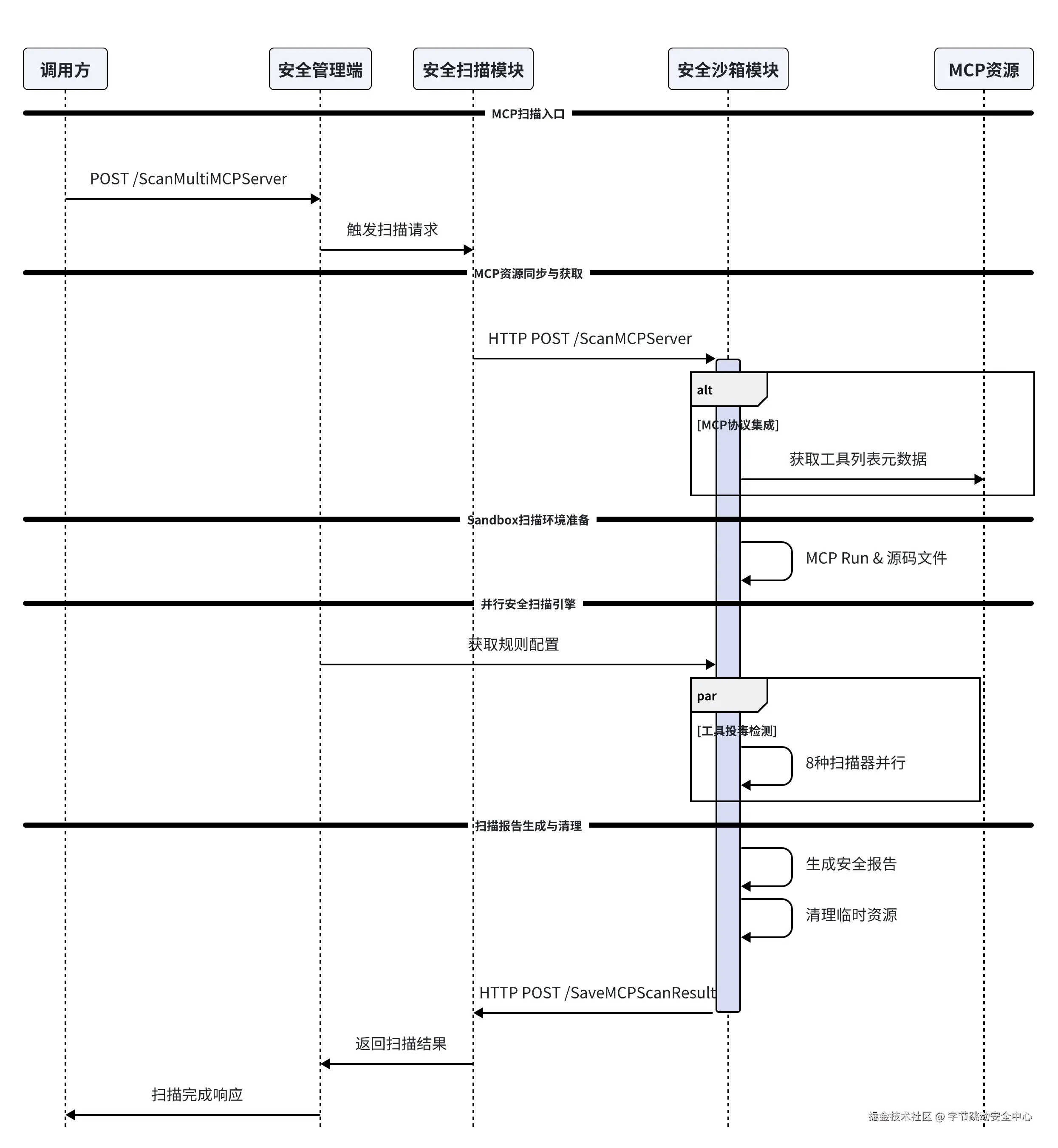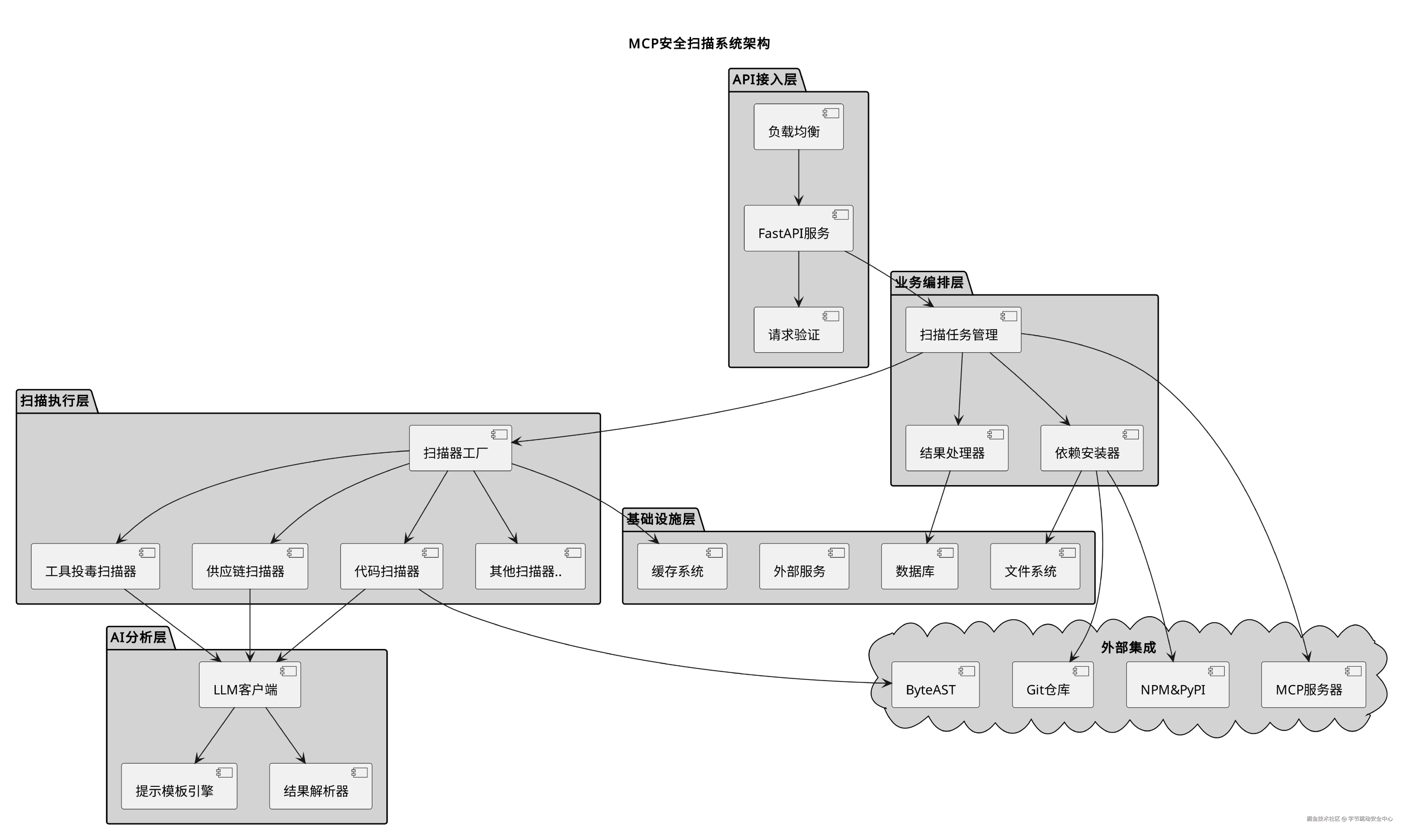 系统首先接收扫描请求,解析 MCP 配置文件和集成参数,这个阶段目的是确定后续扫描的目标范围和执行策略。