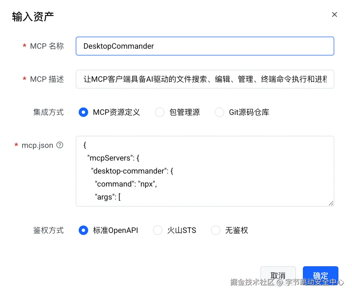 系统支持自动/手动导入MCP资产,自动导入可以通过OpenAPI对接MCP HUB平台,将MCP资产同步;手动导入方式考虑多种集成类型,包括mcp config.json、git仓库代码、依赖包等方式,从而确保对现有的MCP类型都能够有良好的集成途径。