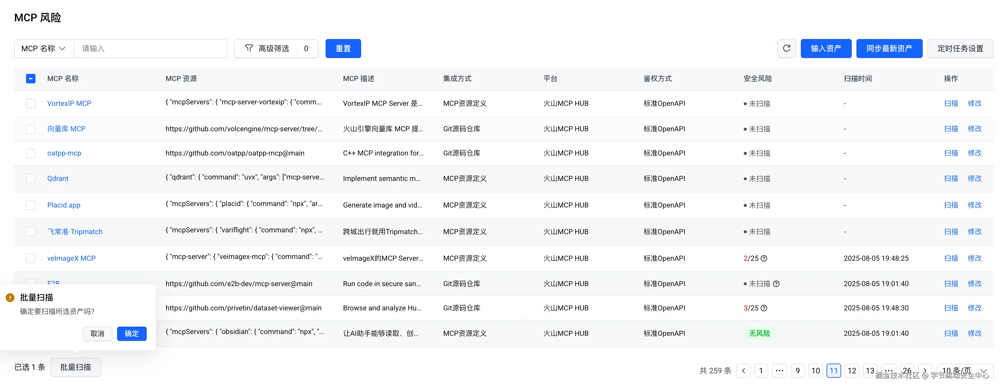 通过提供定时自动同步和手动触发同步两种资产同步方式,搭配灵活的扫描策略 ------ 其中增量扫描聚焦新增或变动的资产、全量扫描覆盖所有资产,将这些资产管理与安全检测能力,深度融入 MCP 的资产准入、上架等关键环节,提前排查风险,确保资产从进入到正式上线的全流程安全。