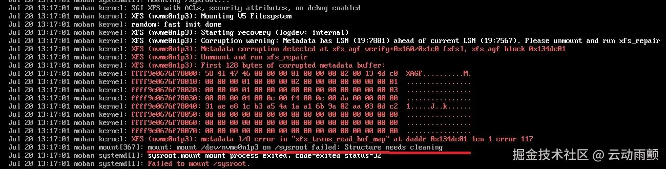 如果日志显示是XFS文件系统损坏(比如报错里有"XFS"),就用xfs_repair
