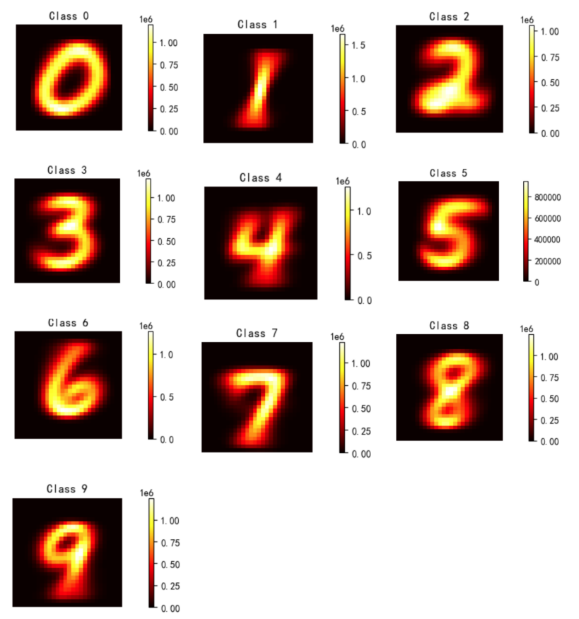 首先对每个数字标识的图像样本进行了像素级的分布统计分析。基于统计结果,采用热图这一可视化工具来展示像素值的分布情况。热图通过颜色编码的方式直观地表示数据的密集程度,其中颜色的深浅变化对应于数据分布的密集与稀疏。