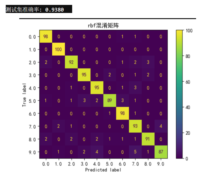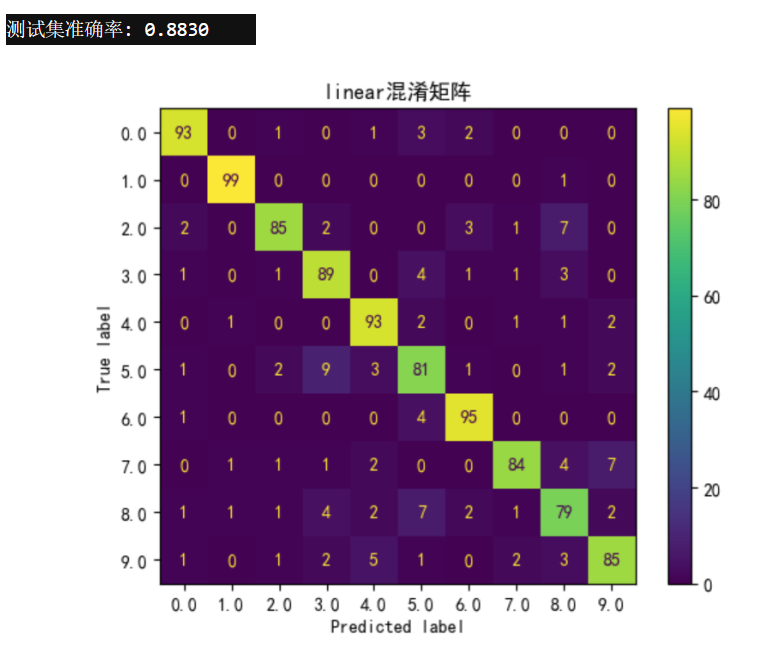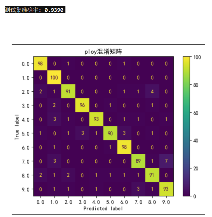 在本次课程设计中,我们针对手写数字识别的实际问题进行了深入研究,并成功实现了模型的预期目标。通过训练不同核函数的SVM模型,我们得到了以下结果: