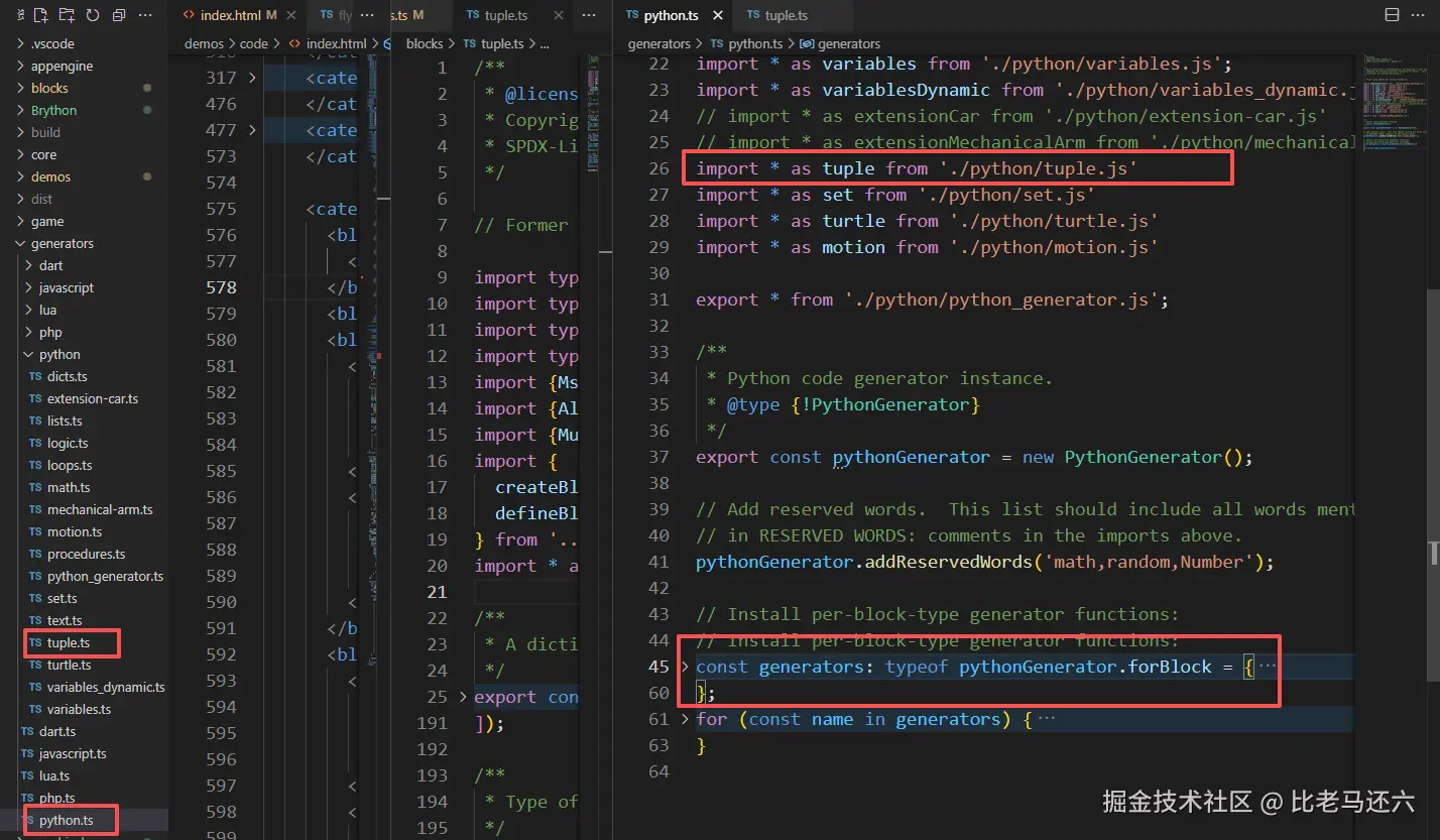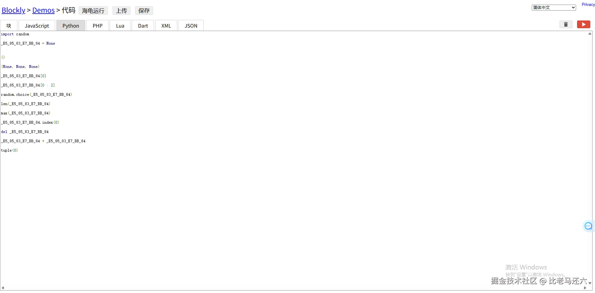 至此元组python已经完成,看一下效果图 总结:由于我的blockly项目是typescript的,有些开发人员项目和我并不相同,特别是引入的一些库文件有所不同,在用的时候要留一下,避免陷入太深,具体代码更具自己的项目改动一下就可以使用