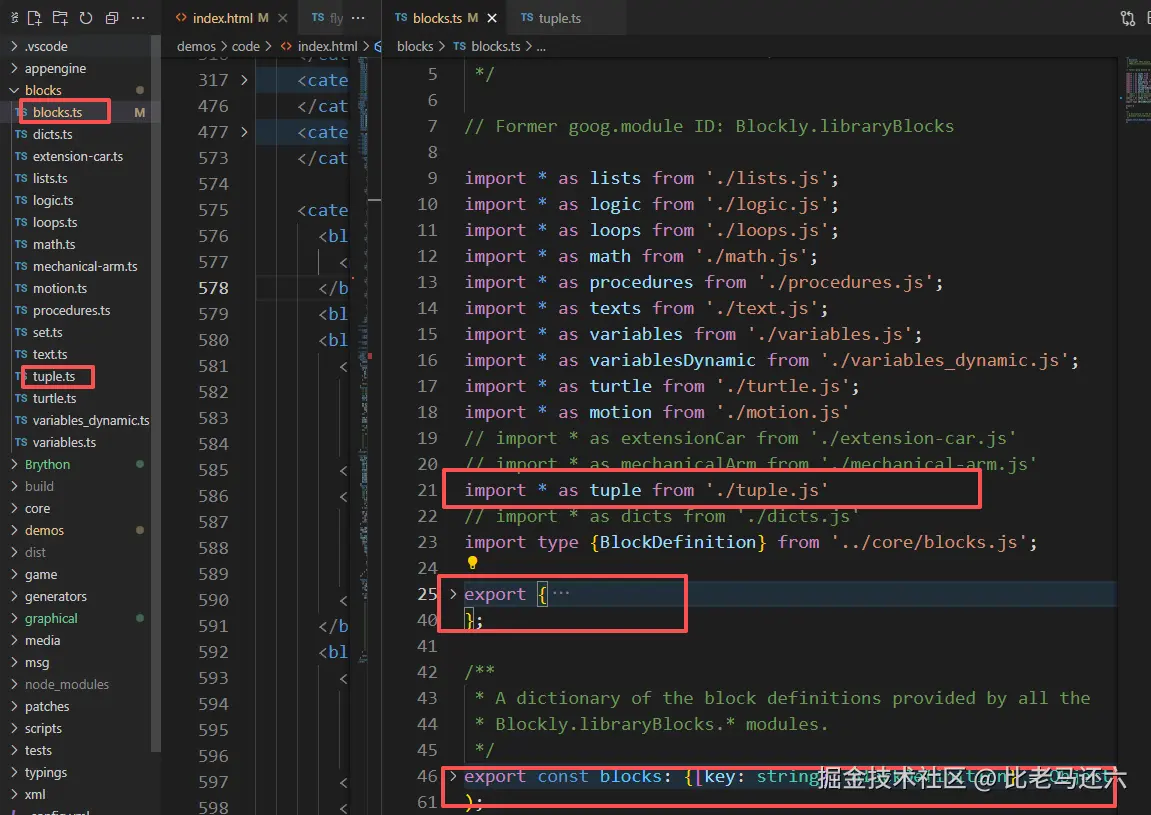 1,涉及要修改得文件(blocks,tuple这个是要自己创建) 2,blocks文件引入tuple文件,并在export导出要积木