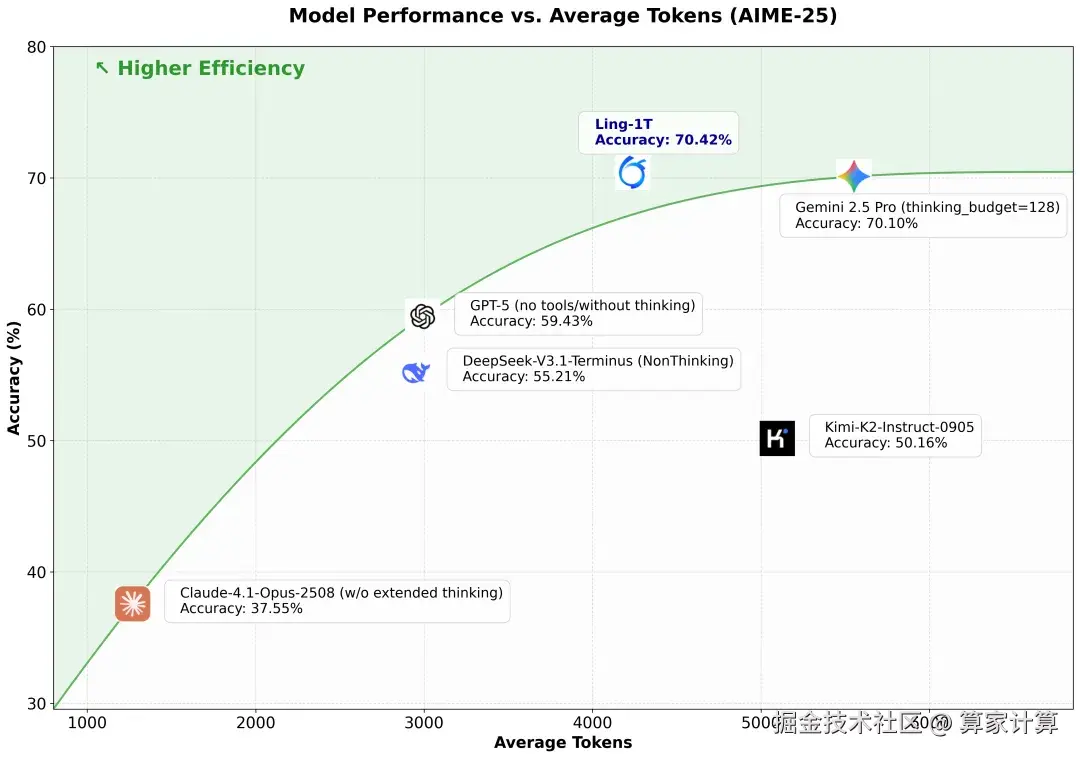 尤为引人注目的是,在竞赛数学榜单AIME 25的测试中,Ling-1T以更少的Token消耗实现了70.42%的准确率,这一表现甚至优于Gemini-2.5-Pro。这表明其不仅在规模上实现了突破,在推理效率和精度上也达到了国际领先水平。