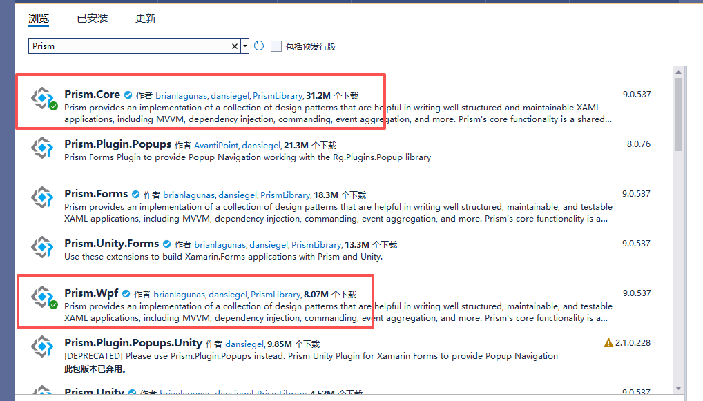 1、安装Prism.Core和Prism.Wpf,其他的包根据后续实际使用在安装。