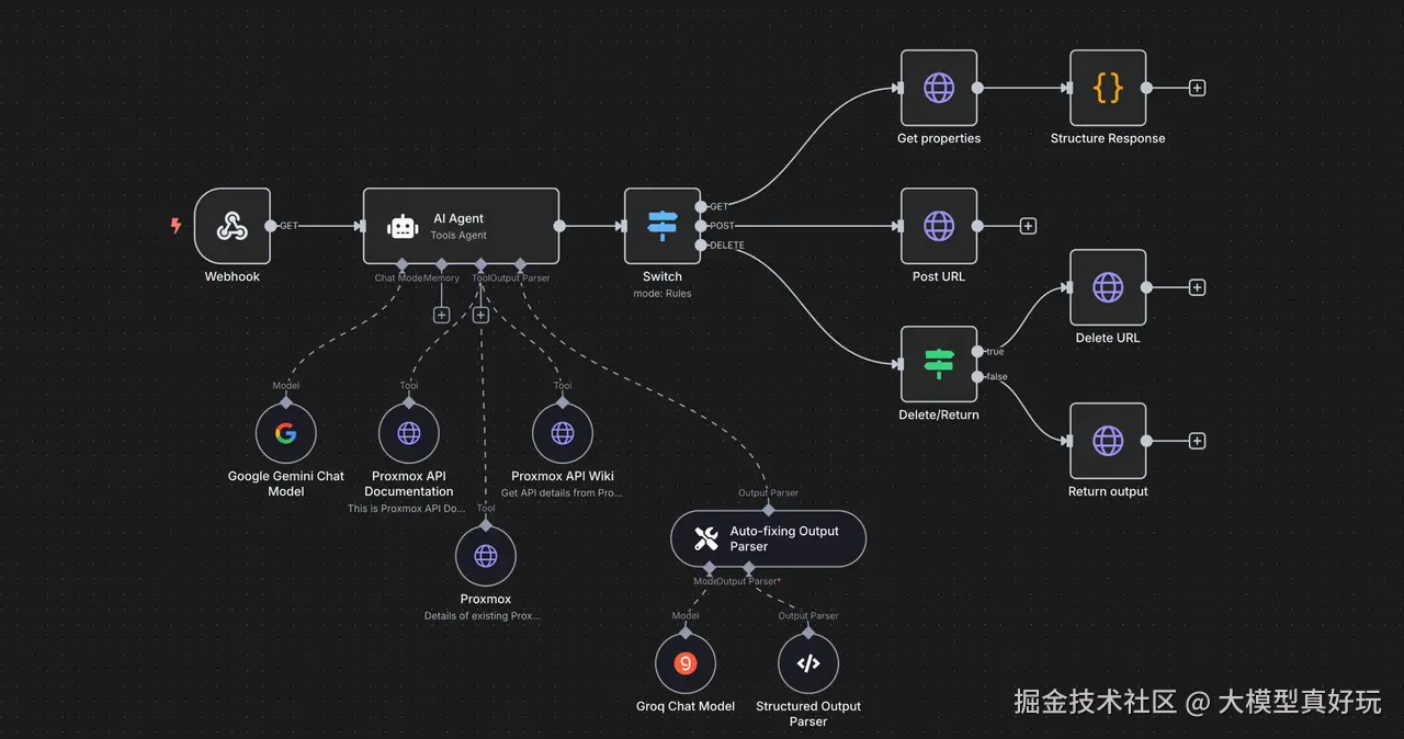 大语言模型兴起后,开发者将n8n创新性的用于Agent开发。例如,可以在工作流中嵌入 OpenAI、Anthropic、DeepSeek 等模型节点,再结合搜索引擎、数据库、Webhook 等外部工具,快速搭建一个具备多工具调用能力的智能体。虽然它不像 Dify 那样专注于 Agent 开发场景,但凭借强大的工具集成能力,n8n 成为不少开发者在构建企业自动化 Agent 时的首选框架之一。