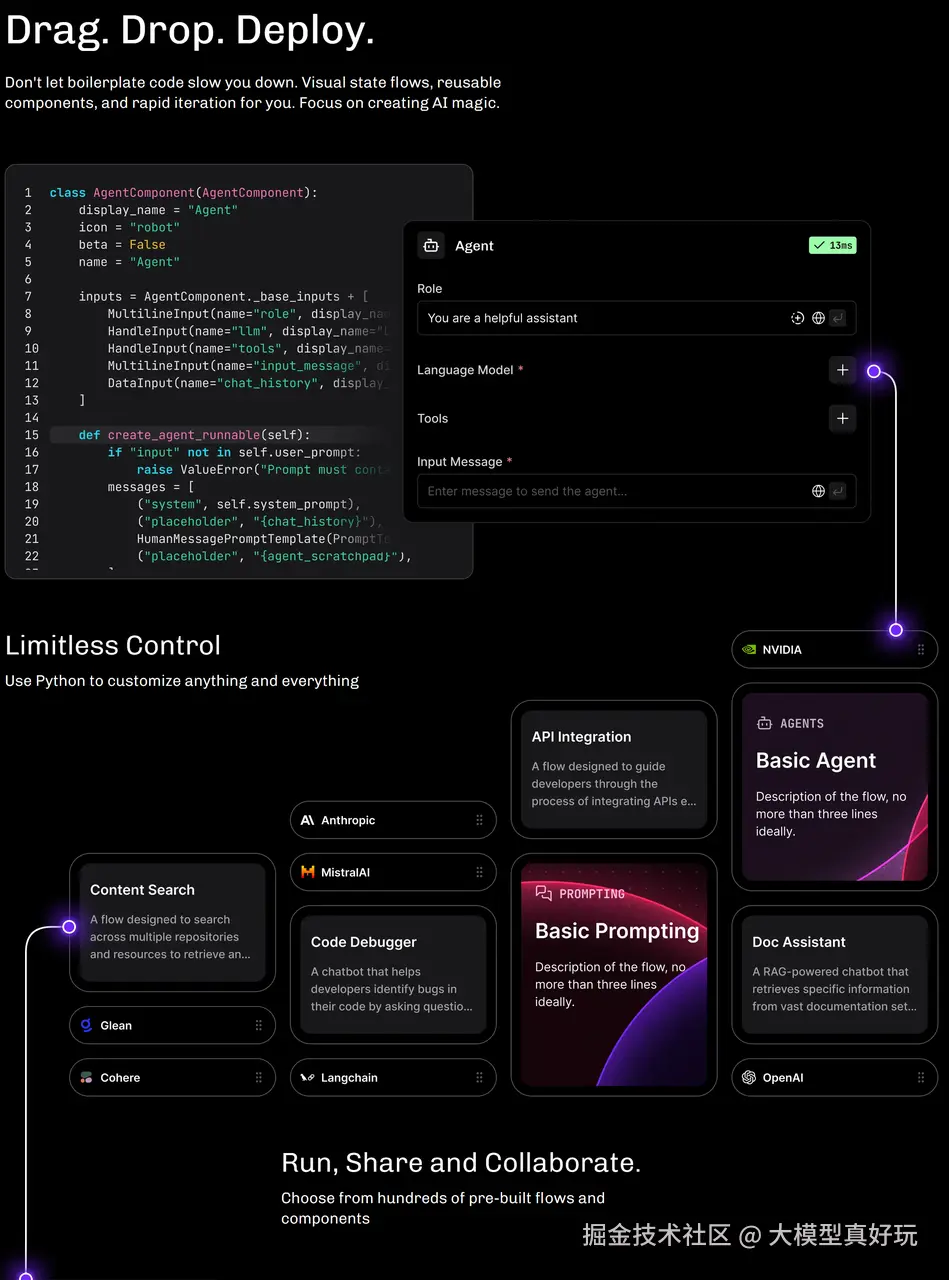 LangFlow是一款基于 LangChain 生态 的低代码可视化开发工具,主要目标是降低 LangChain 在实际应用中的使用门槛。如果缺乏编程经验的用户阅读笔者《深入浅出LangChain/LangGraph Agent开发》 的专栏总会觉得LangChain或LangGraph"代码优先"的定位上手难度较高,而 LangFlow 则提供了一个图形化的画布界面,让开发者能够通过拖拽与配置的方式,快速搭建对话应用与智能体。