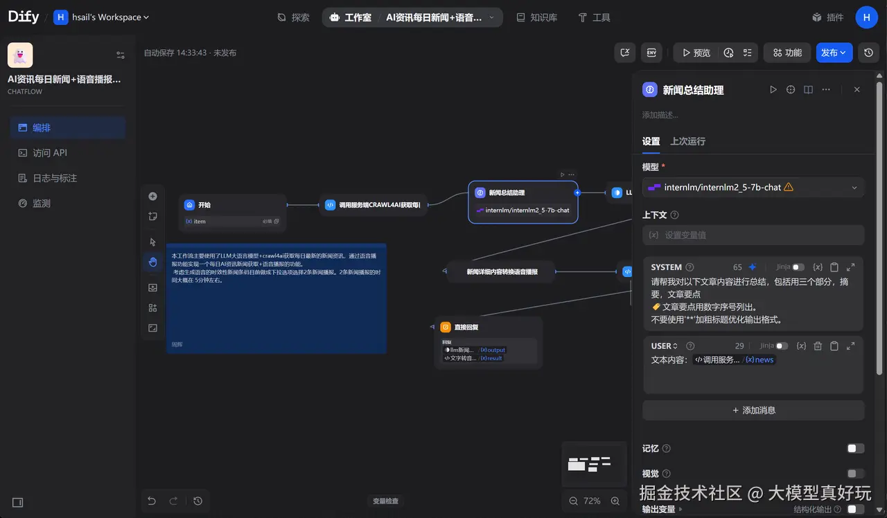 与早期 Coze 高度自动化的模式不同,Dify 自诞生之初就强调在降低门槛的同时,不牺牲开发的灵活性与控制力。它提供了直观的可视化工作流编辑器,采用类似 Figma 的拖拽式界面,让开发者可以通过连接不同的节点(如 LLM 调用、条件判断、知识库检索、代码执行等)来编排复杂的 AI 应用逻辑。这种设计哲学体现了其"所见即所得"的理念,显著降低了 AI 应用的开发现代门槛。
