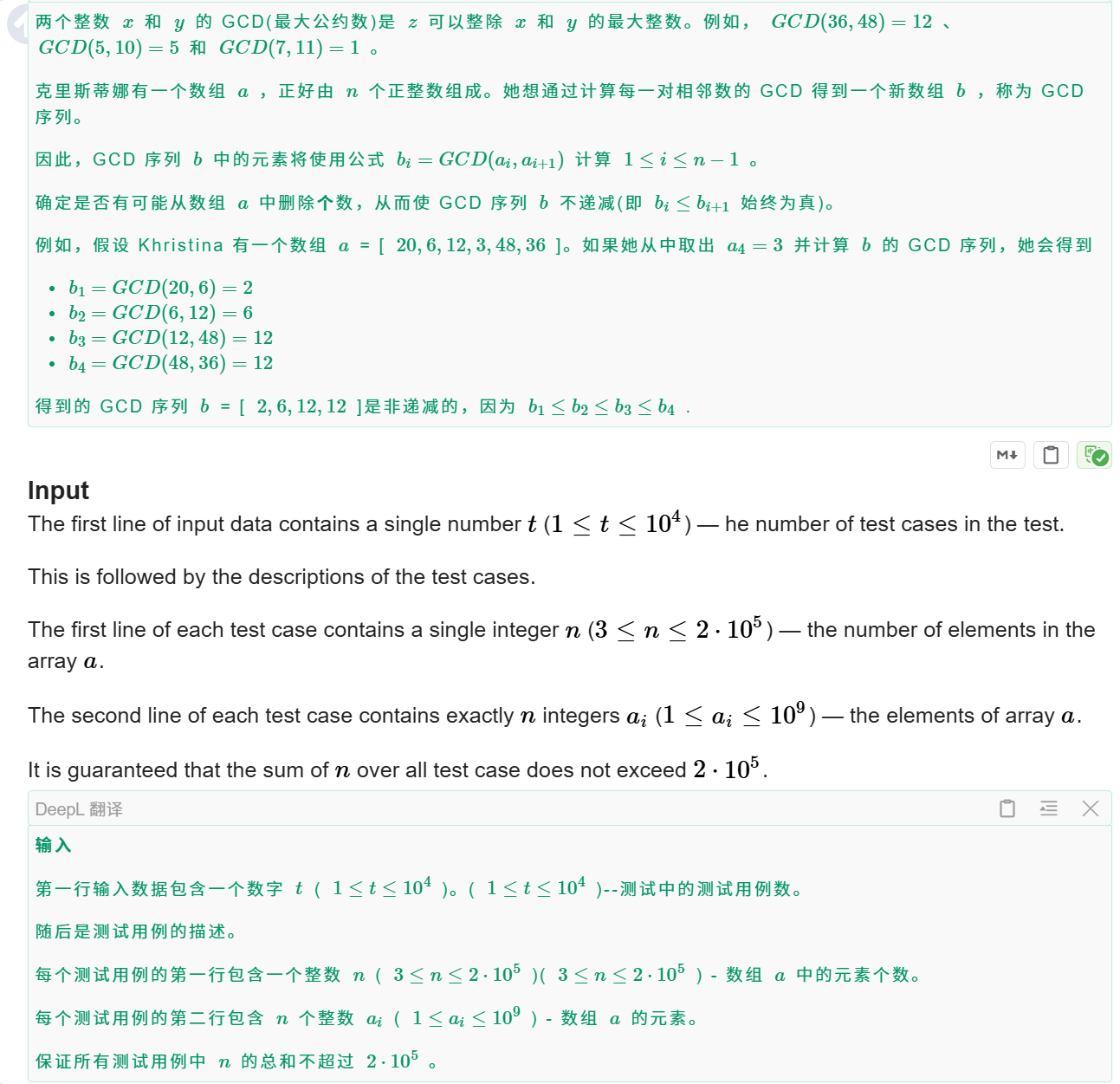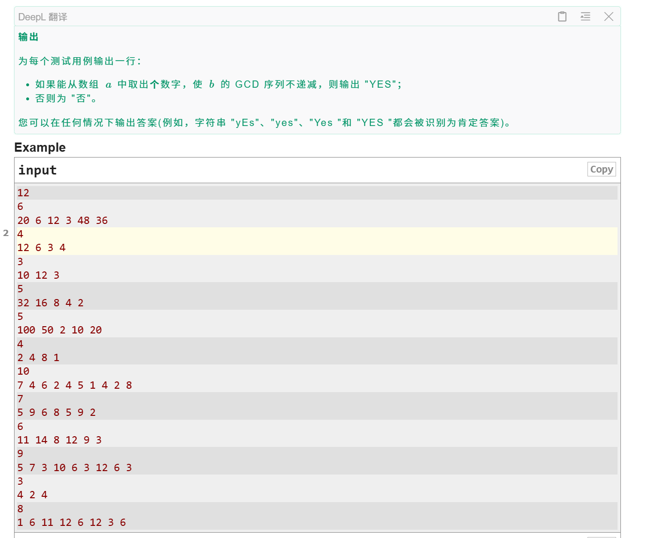 先算出原始的b数组(gcd之后的数组),然后从左向右遍历找出第一个b[i]>b[i+1]的位置i,这时出问题的值可能有三个a[i],a[i+1],a[i+2],依次去掉这三个值,获得去掉该值后的三个b数组,若三个数组存在一个非减数组,则输出"YES",如果不存在,输出"NO"。