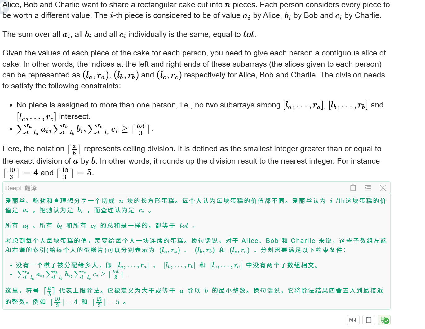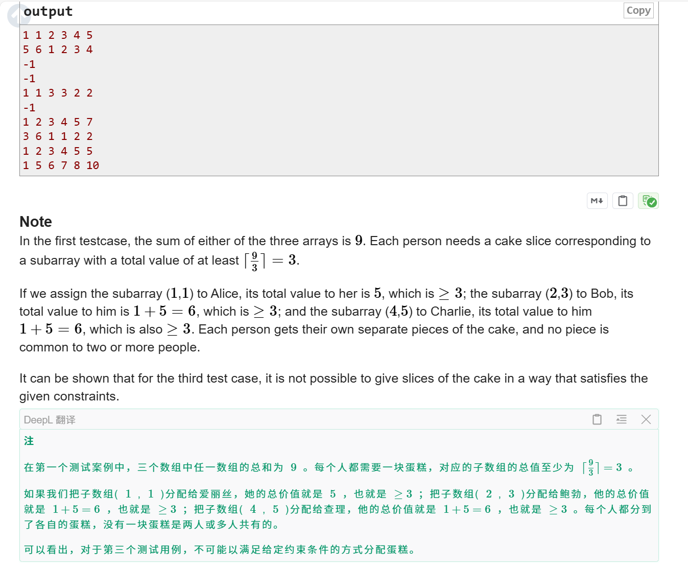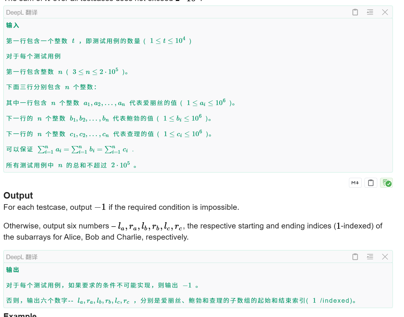 对给定的三个数组分别使用前缀和,枚举三人l和r的先后顺序(共六种)分别判断是否符合条件,若符合条件则输出。