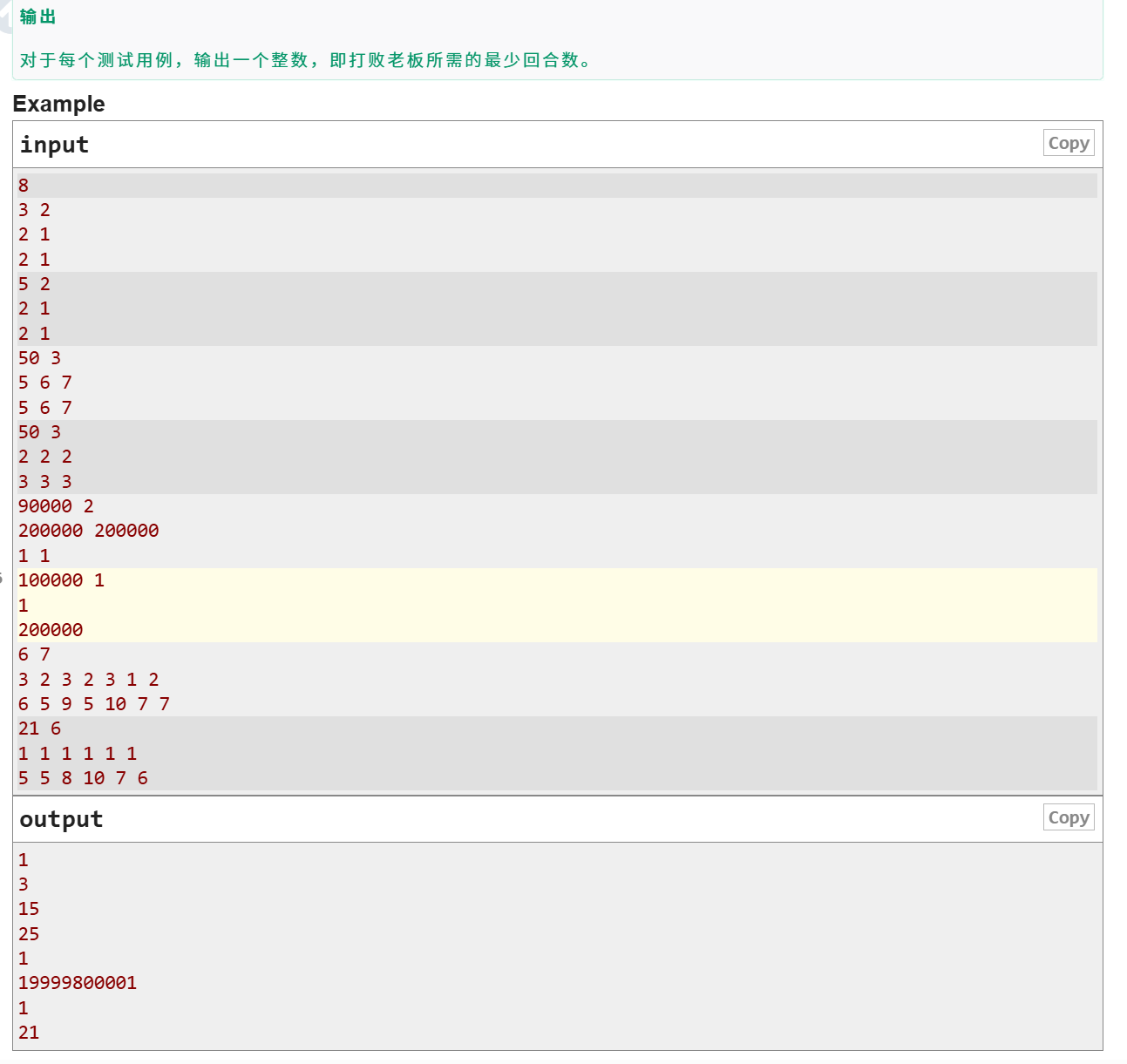 来自题解。利用set存入结构体pair,,结构体中的第一个变量代表第几个回合,第二个变量代表第几个技能,set首先按照结构体第一个变量大小排序,若第一个值大小相等,则按照第二个排序,具体思路见代码注释。