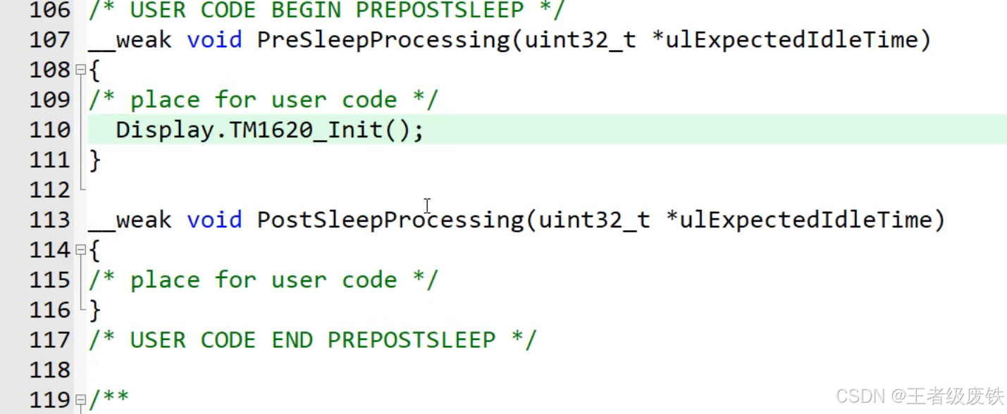 3、在进入与退出Tickless模式时增加代码,通常是关闭外设等,此例程是关闭数码管显示,作为演示用。