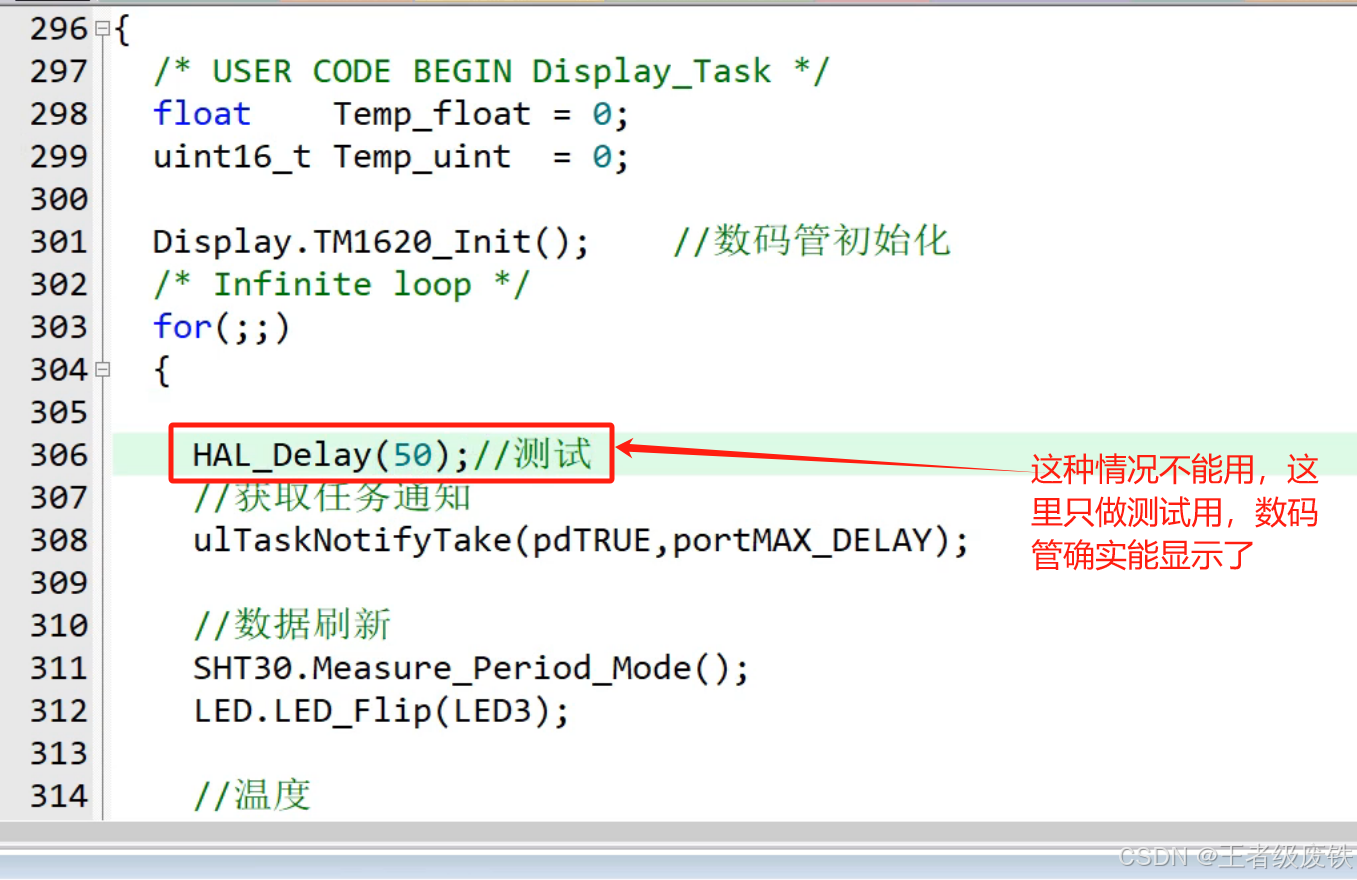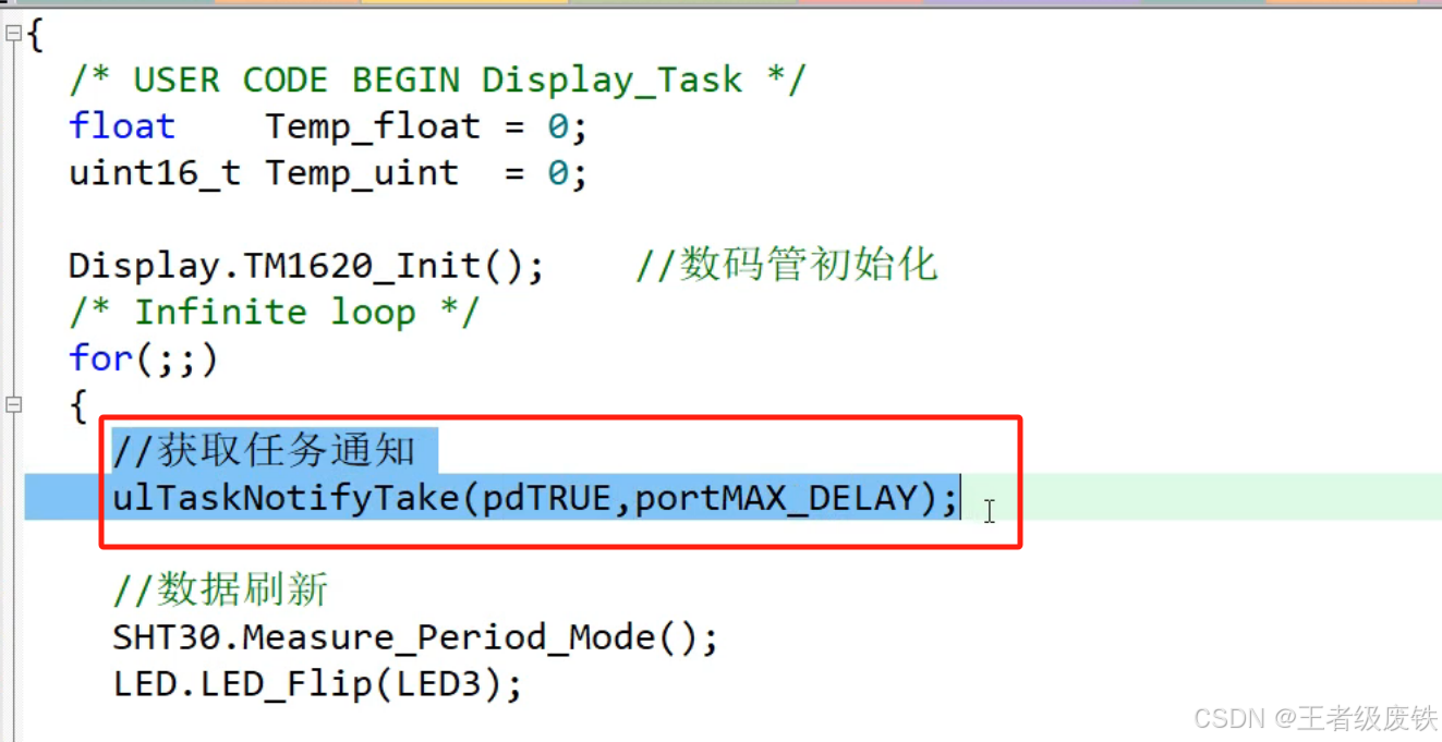 数码管的刷新任务中有这个获取任务通知,当任务中获取到了任务通知,会更新数码管,让数码管亮起来,当进入休眠的时候,又会关闭数码管,这样数码管就会一闪一闪的,但是如果时间太短,人眼无法看到,所以要想办法能够看到,办法就是在获取任务通知之前延时几十毫秒