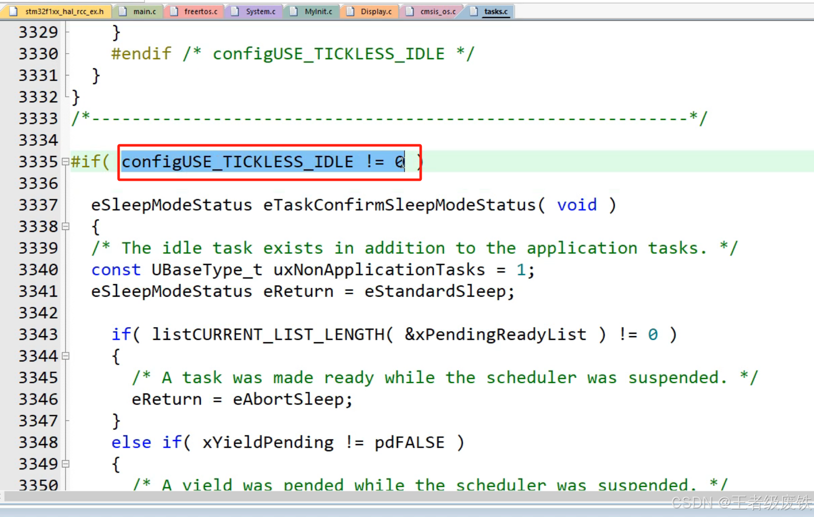 在空闲任务中监测是否开启了低功耗Tickless模式,也就是前面说的configUSE_TICKLESS_IDLE宏