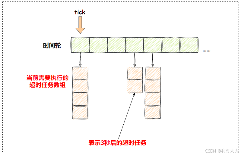 每秒钟向后走动一步,走到哪里,则代表哪里的任务超时了,该执行对应的超时任务了 ,比如我们想要定一个三秒后的任务,则只需要将任务添加到 tick + 3