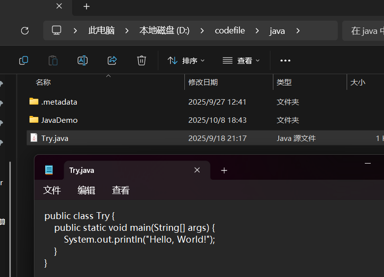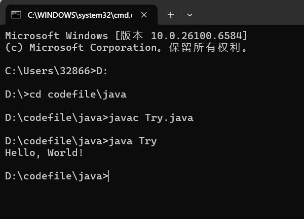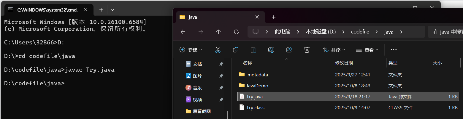 先切换盘符到指定文件夹,再用javac编译Try.java文件,成功编译之后可以发现多了个.class文件(源程序的字节码文件,操作系统能识别)
