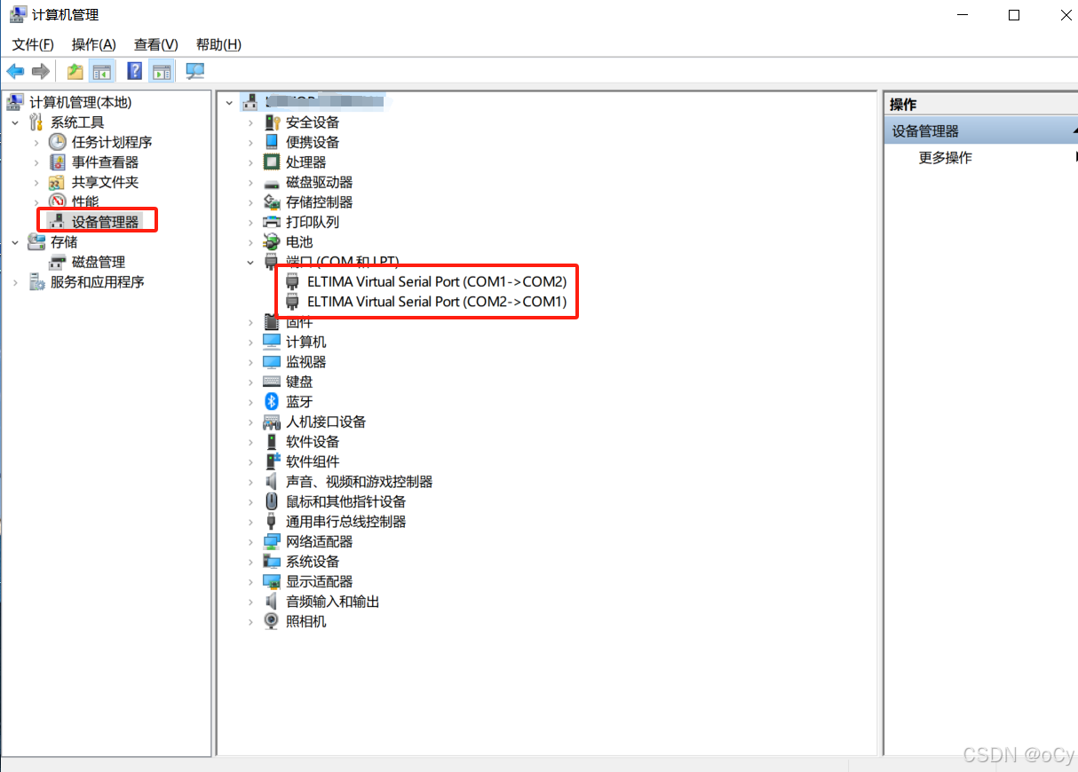 如上图是在右边填写COM1和COM2,并点击【添加端口】之后,在左边就看到有两个虚拟串口了,这个工具是帮助我们在window的驱动层常见了COM1->COM2,COM2->COM1的虚拟串口,这两个串口是绑定使用的,在下面的【设备管理器】界面更容易理解: