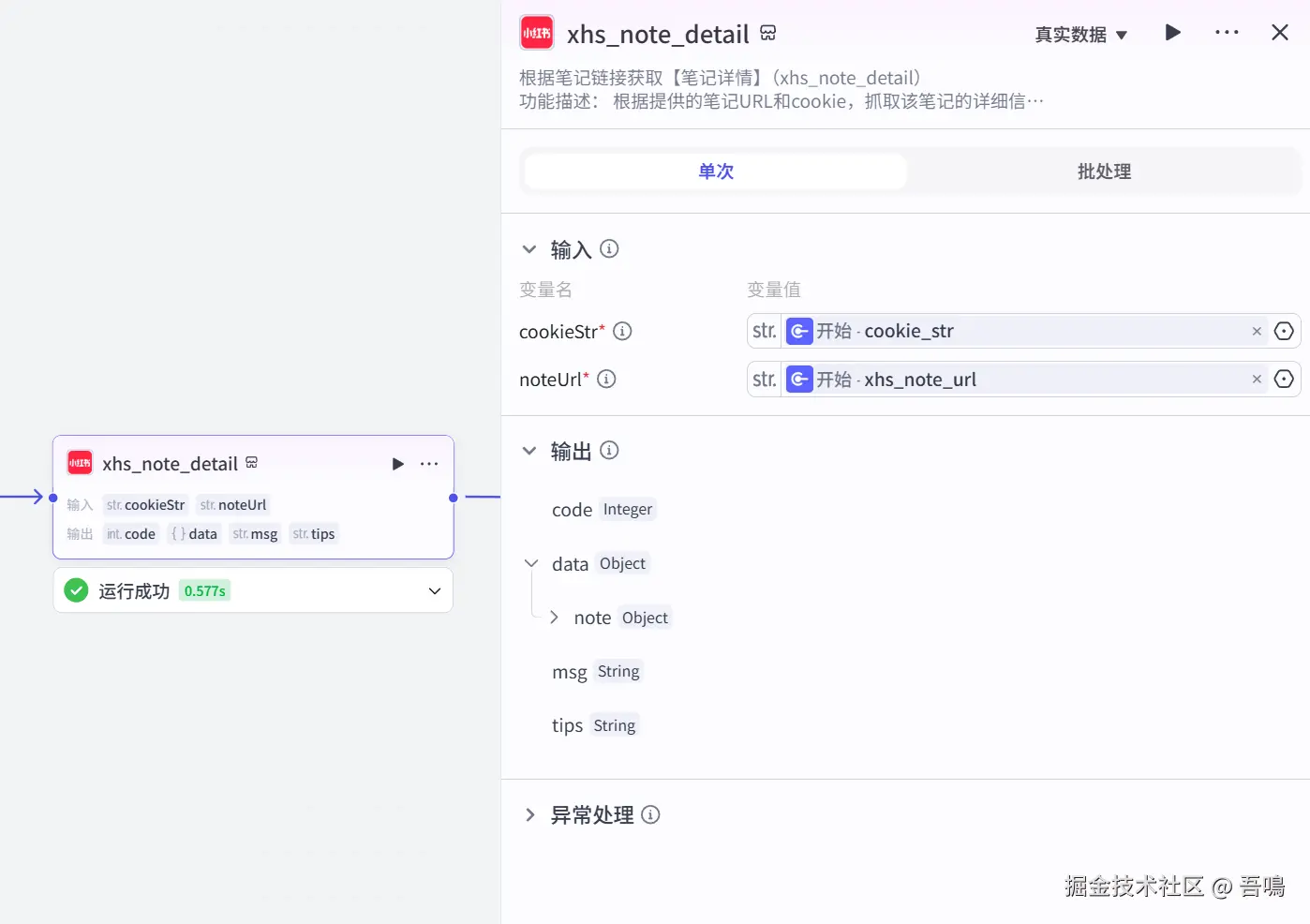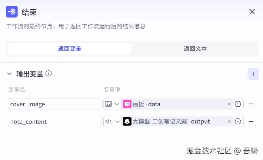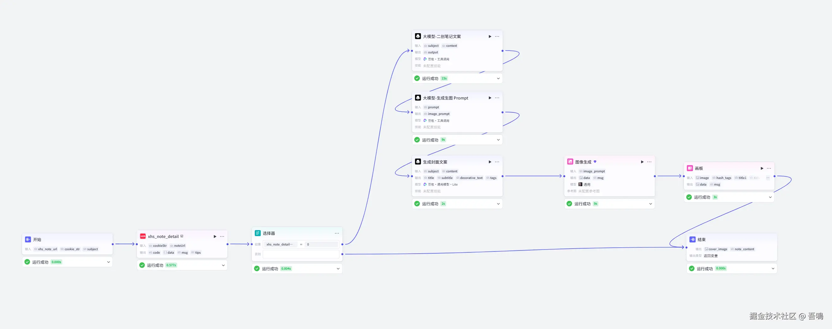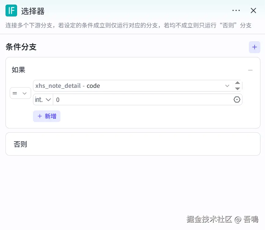 用于判断小红书笔记内容获取是否成功,不成功则结束工作流。使用了扣子的【选择器】节点。
