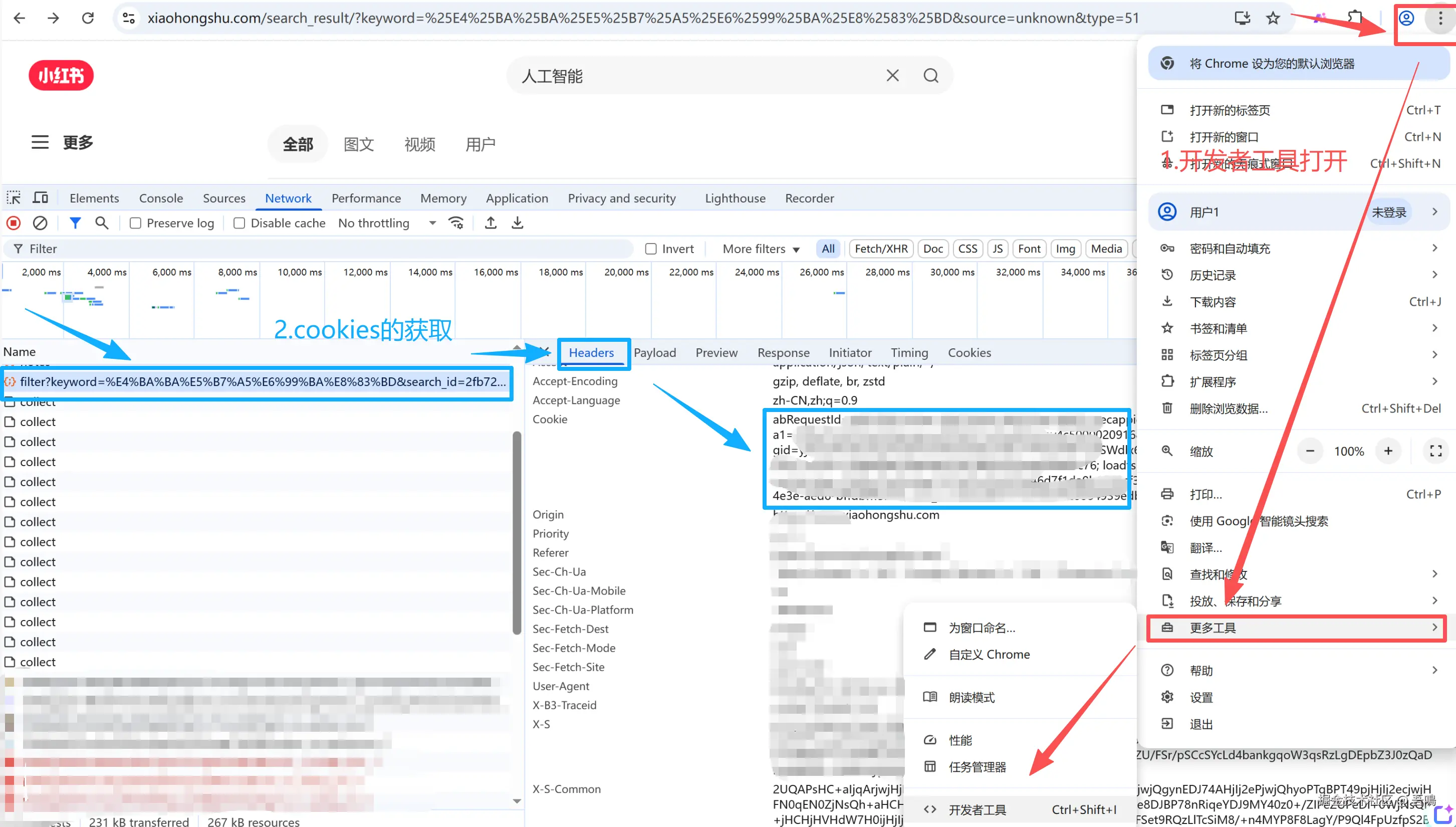打开开发者工具后,在输入框输入一个关键字进行搜索,找到截图的这个请求,在Headers这个Tab页找到对应的cookie,复制黏贴到工作流中即可。